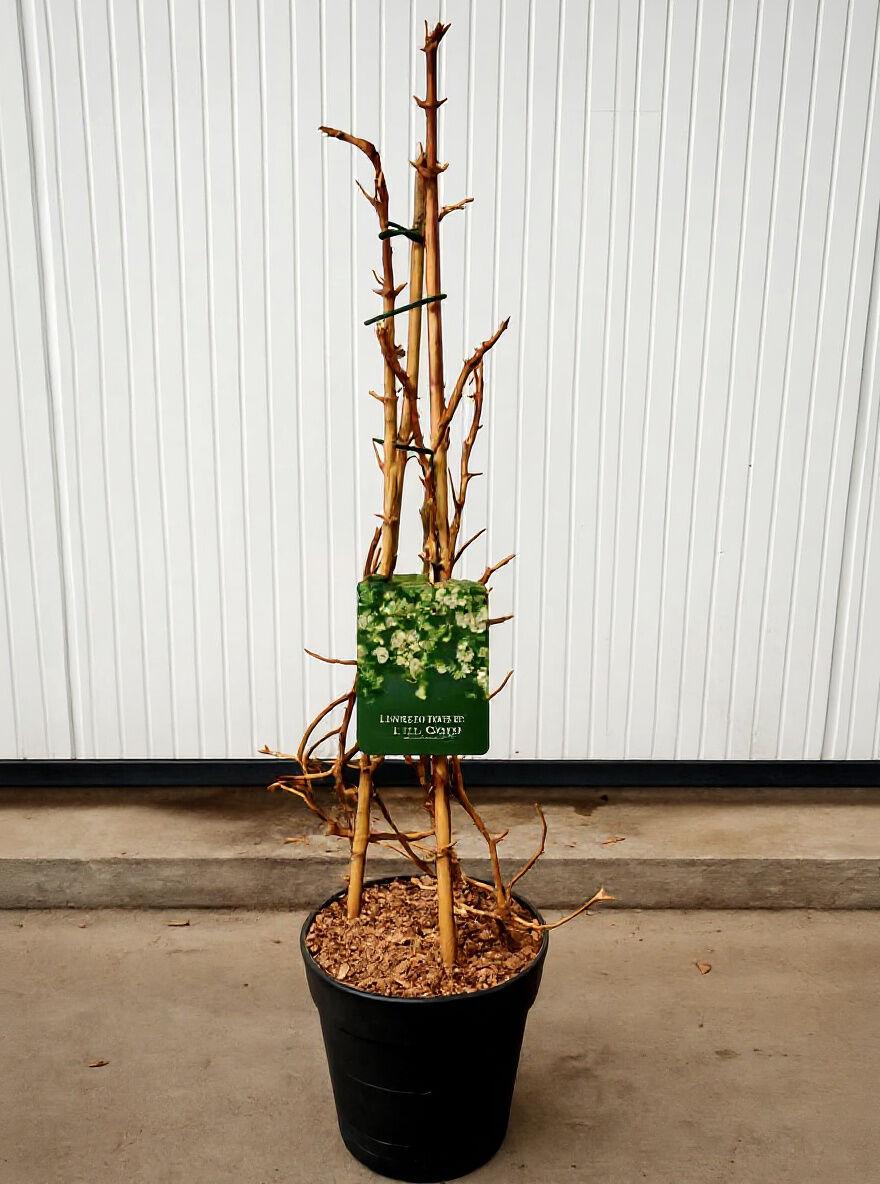 Hydrangea anomala petiolaris (Kletter-Hortensie) im Topf, aufgebunden an Stäben, mit grünen Blättern und Klettertrieben.