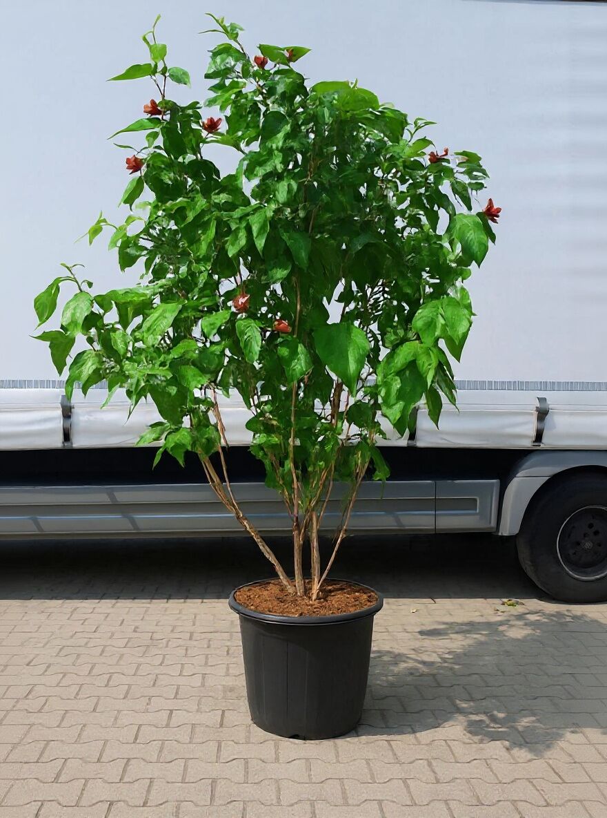 Gewürzstrauch 'Aphrodite' (Calycanthus floridus 'Aphrodite') 250–300 cm, Schirmform, im Container mit grünem Laub und roten Blüten