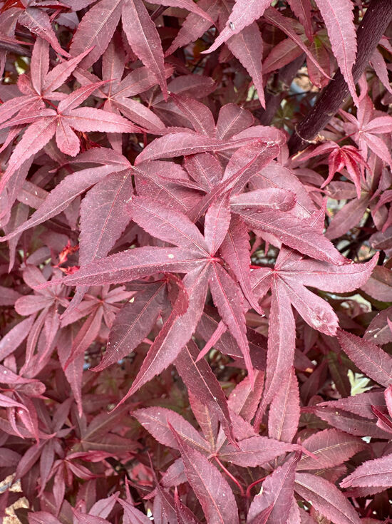| Blatt: | Sommergrün, handförmig, 5 bis 7 lappig, tief geschlitzt, filigran Austrieb rosarot, im Sommer dunkles Weinrot, Herbstfärbung Rotorange |