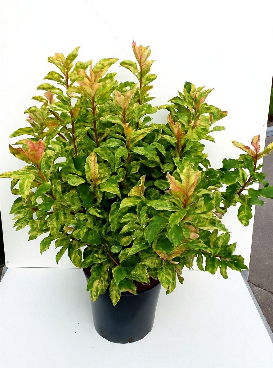 | Blatt: | Immergrün, lanzettlich, glänzend, Austrieb pink, dann grün- weiß panaschiert, sehr dekorativ. |