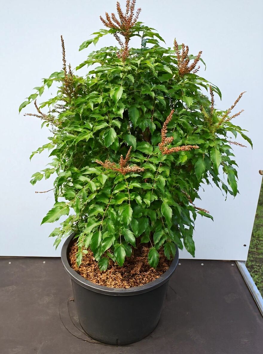 | Blüte: | Orangegelbe Blüten bilden aufrechte Rispen, Knospen orangerot, Blüte folgt im Herbst, duftend, insektenfreundlich. |