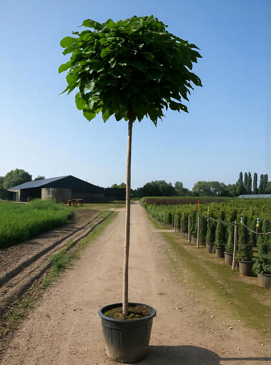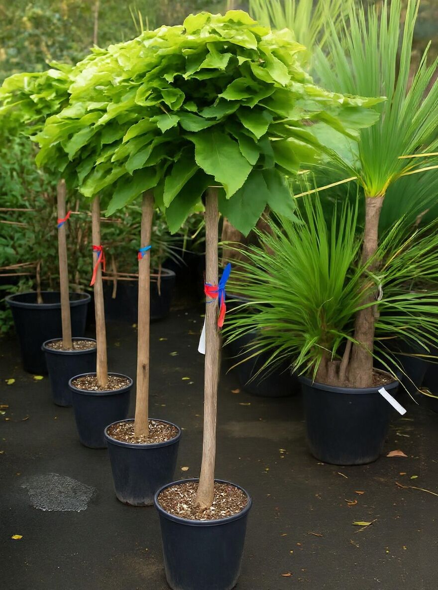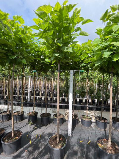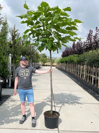 Der Kugel-Trompetenbaum ist ein sehr beliebter Hausbaum, der in unzähligen deutschen Gärten anzutreffen ist. Er wird für seinen kugelrunde, außergewöhnlich schöne Krone gefeiert und verleiht jedem Standort einen unvergleichlichen Charme. Das großflächige Blatt wirkt nahezu tropisch und belebt die Umgebung mit einer natürlichen Frische, die den Baum zu einem Blickfang macht. Weiterhin gilt er als anspruchslos und sauber. Er eignet sich hervorragend als Hausbaum, um an einer Terrasse gepflanzt Schatten zu spenden oder auch als geometrischer Akzent in einem Eingangsbereich. Aufgrund seiner geringen Endhöhe eröffnet die Selektion ’Nana‘ dem Gärtner einen vielseitiges Pflanzspektrum, sodass er als Straßenbaum in engen Straßen genauso genutzt werden kann wie als Kübelgewächs in einem kargen Innenhof.