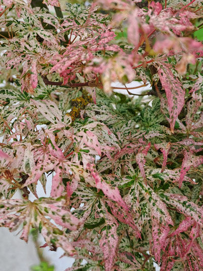 | Blatt: | Sommergrün, fünflappig, am Ende zugespitzt, tief eingeschnitten, gezahnter Rand, im Austrieb blassrot, dann hellgrün bis dunkelgrün mit unregelmäßig weißen und rosafarbenen Sprenkeln und Flecken, marmorähnlich, manche Blätter sogar ganz weiß, im Herbst orange bis gelb, 5 bis 10 cm groß. |