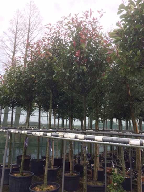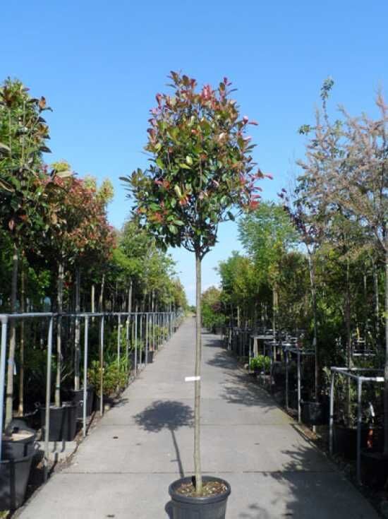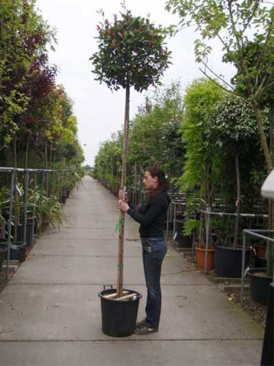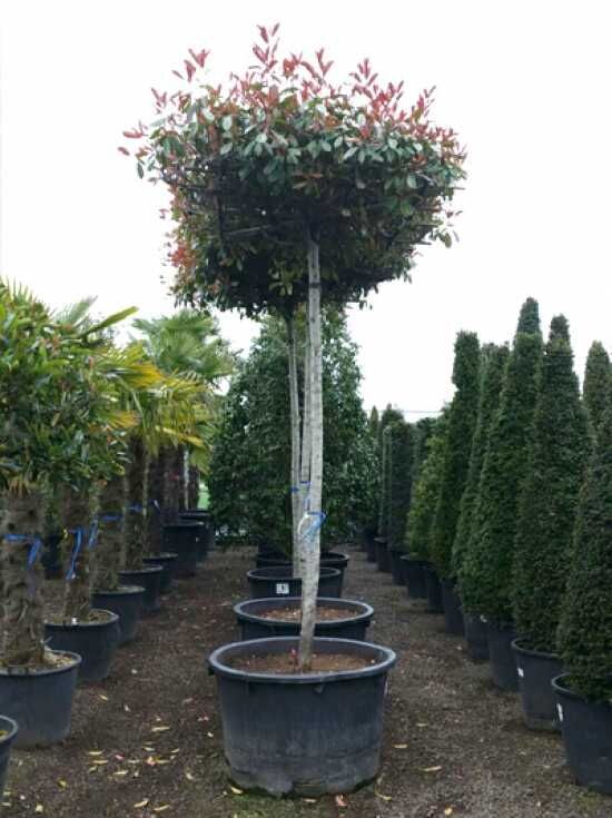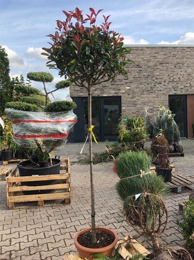 Eigenschaften: | Die Photinia fraseri 'Red Robin' Hochstamm (Glanzmispel 'Red Robin') ist frosthart, hitzeresistent und äußerst attraktiv. Sicherlich eine der Pflanzen, die in den letzten Jahren den größten Fan-Zuwachs verzeichnen konnte. Sie blüht überschwenglich und zeigt vor allem mit ihrem rot-grünen Laub eine Farbkombination, die ihres Gleichen sucht. Tolles immergrünes Gehölz. Auch als Kugelbaum sehr interessant! Der Photinia Hochstamm bietet ebenfalls einen immergrünen Sichtschutz zum Nachbargrundstück. |