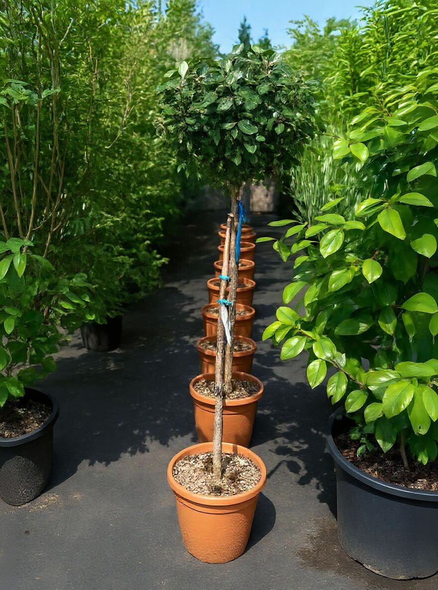Hallo, beim Elaeagnus ebbingei mit 120 cm Stamm ist tatsächlich die reine Stammhöhe gemeint. Topf und Krone wird nicht mitgemessen. Damit treffen Sie eine tolle Auswahl. Die silbrig-grünen, leicht glänzenden Blätter mit der charakteristischen silbernen Unterseite sorgen das ganze Jahr über für ein edles Aussehen. Durch den Kugelschnitt auf einem Stamm entsteht eine harmonische, architektonische Optik, die sich gut in moderne und klassische Gärten einfügt. Sie ist sehr widerstandsfähig gegenüber Wind, salziger Luft (ideal für Küstenregionen) und Trockenheit. m Herbst erscheinen kleine, unscheinbare, aber intensiv duftende Blüten, die Bienen und andere Insekten anziehen. Perfekt als Solitärpflanze, für Terrassen oder als elegantes Gestaltungselement in Beeten. Tipp: Ein regelmäßiger Formschnitt sorgt dafür, dass die Kugel schön dicht bleibt!