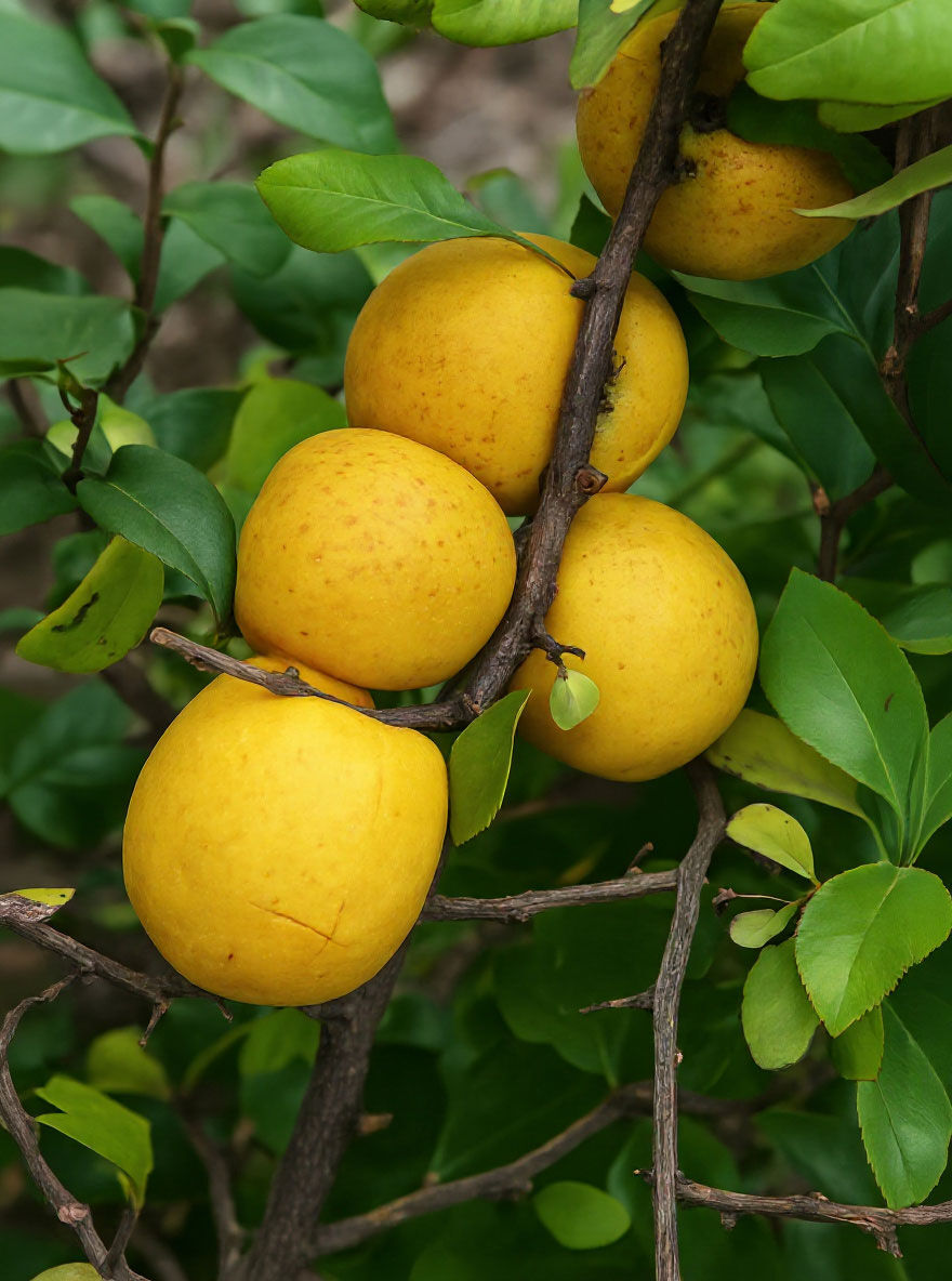 | Frucht: | Gelb, flach kugelig bis breit, rundlich, genießbar. |