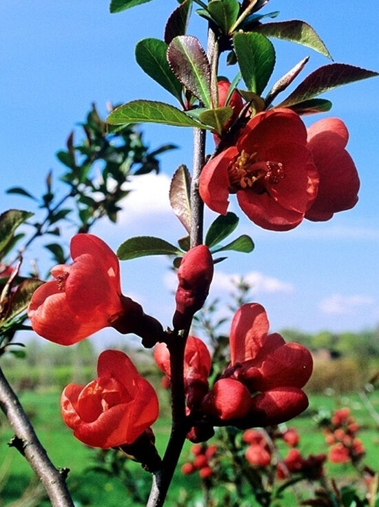 | Eigenschaften: | Die Zierquitte 'Friesdorfer Typ' bezaubert im Frühjahr mit schalenförmigen, hellroten Blüten, deren gelbe Staubgefäße einen schönen Kontrast bilden. Als wichtige Bienenweide und mit dekorativen Blüten ist sie auch ideal für die Vase. Im Spätsommer reifen leuchtend gelbe, aromatisch duftende Früchte, die sich hervorragend für Gelees und Kompott eignen. Ihr breitbuschiger, sparriger Wuchs passt gut in kleine Gärten. Bedornte Triebe machen sie ideal als undurchdringliche Hecke. Selbstbefruchtend, robust und winterhart, gedeiht die Zierquitte an sonnigen bis halbschattigen Standorten auf nahrhaftem, kalkarmem Boden. Ein vielseitiger Zierstrauch!. |
