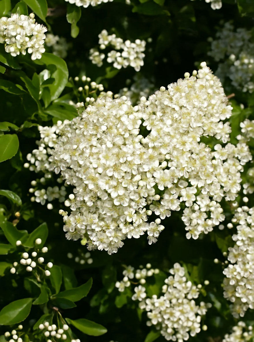 | Blüte: | Weiße Schirmrispen am mehrjährigen Trieb zu Anfang des Sommers (Mai -Juni), mild duftend, Insekten freundlich. |