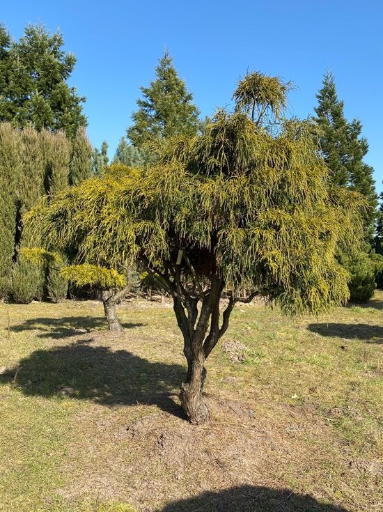 Gelbe Fadenzypresse Sungold (Chamaecyparis pisifera 'Sungold'), Schirmform, ca. 175–200 cm, gelbgrünes, hängendes Nadelwerk