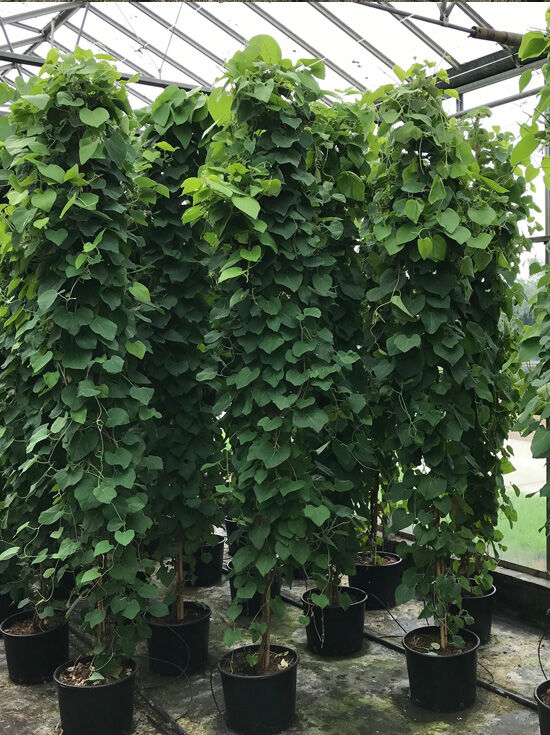 Amerikanische Pfeifenwinde (Aristolochia macrophylla) als Rankpflanze im Topf, mit dichtem grünen Blattwerk an Stäben gezogen