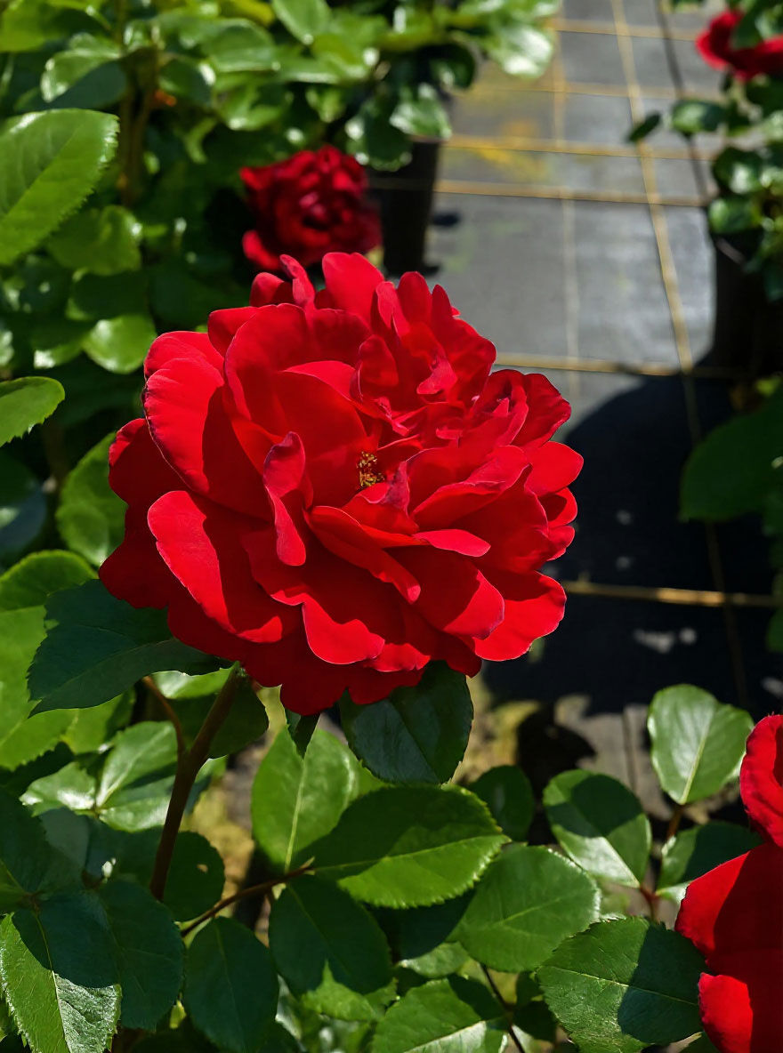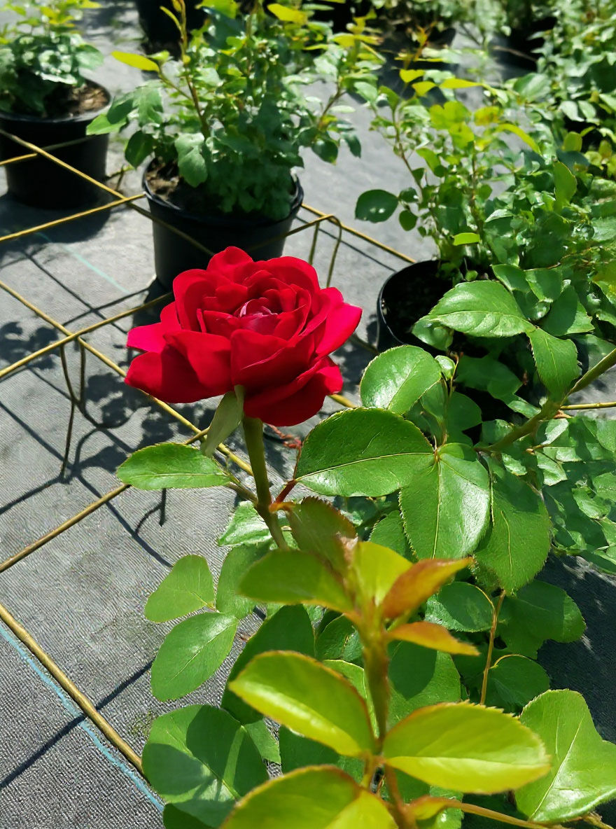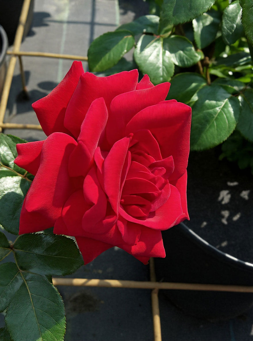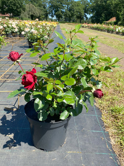 | Blüte: | Dunkelrot, elegant gefüllt, öfter blühend, leicht duftend |