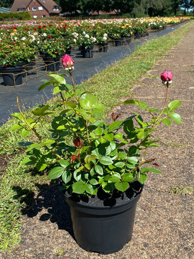 Rosa 'Novalis' ® ADR-Rose / Beetrose 'Novalis' ® ADR-Rose C5 im Topf mit grünen Blättern und zwei rosafarbenen Knospen