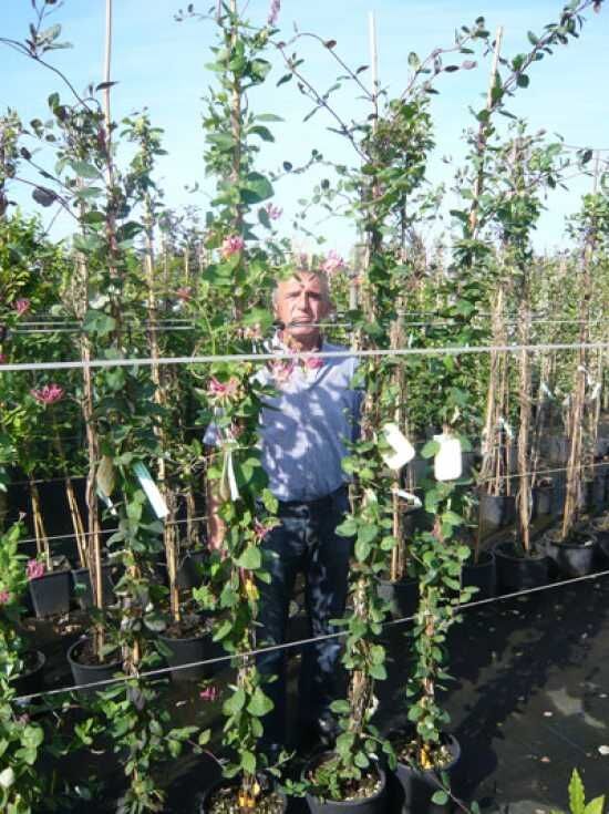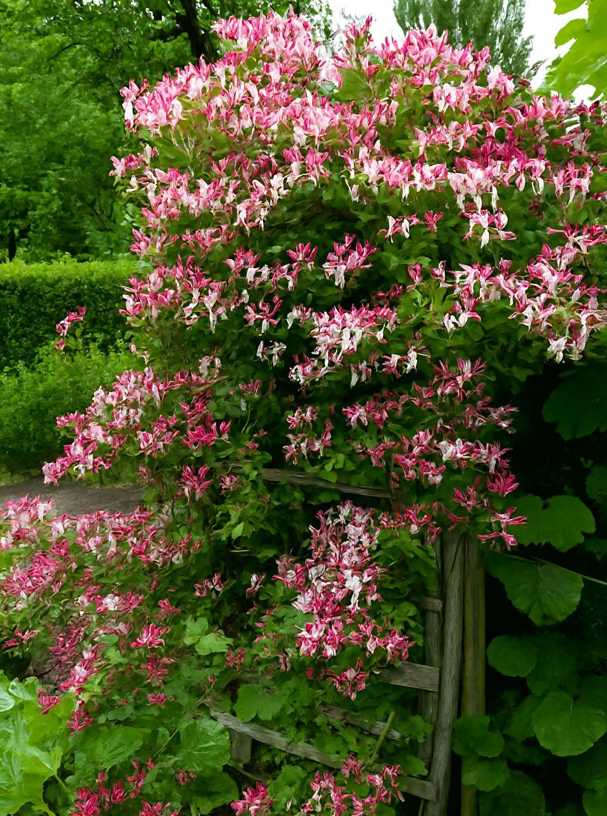 | Wuchs: | Schlingstrauch, stark windend, buschig aufrecht, 3 bis 6 m hoch und 2 bis 4 m breit. |