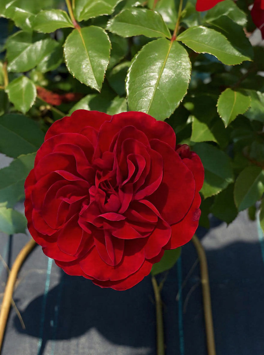 | Blüte: | Leuchtend bordeauxrot, gefüllt, kugelförmig, öfter blühend |