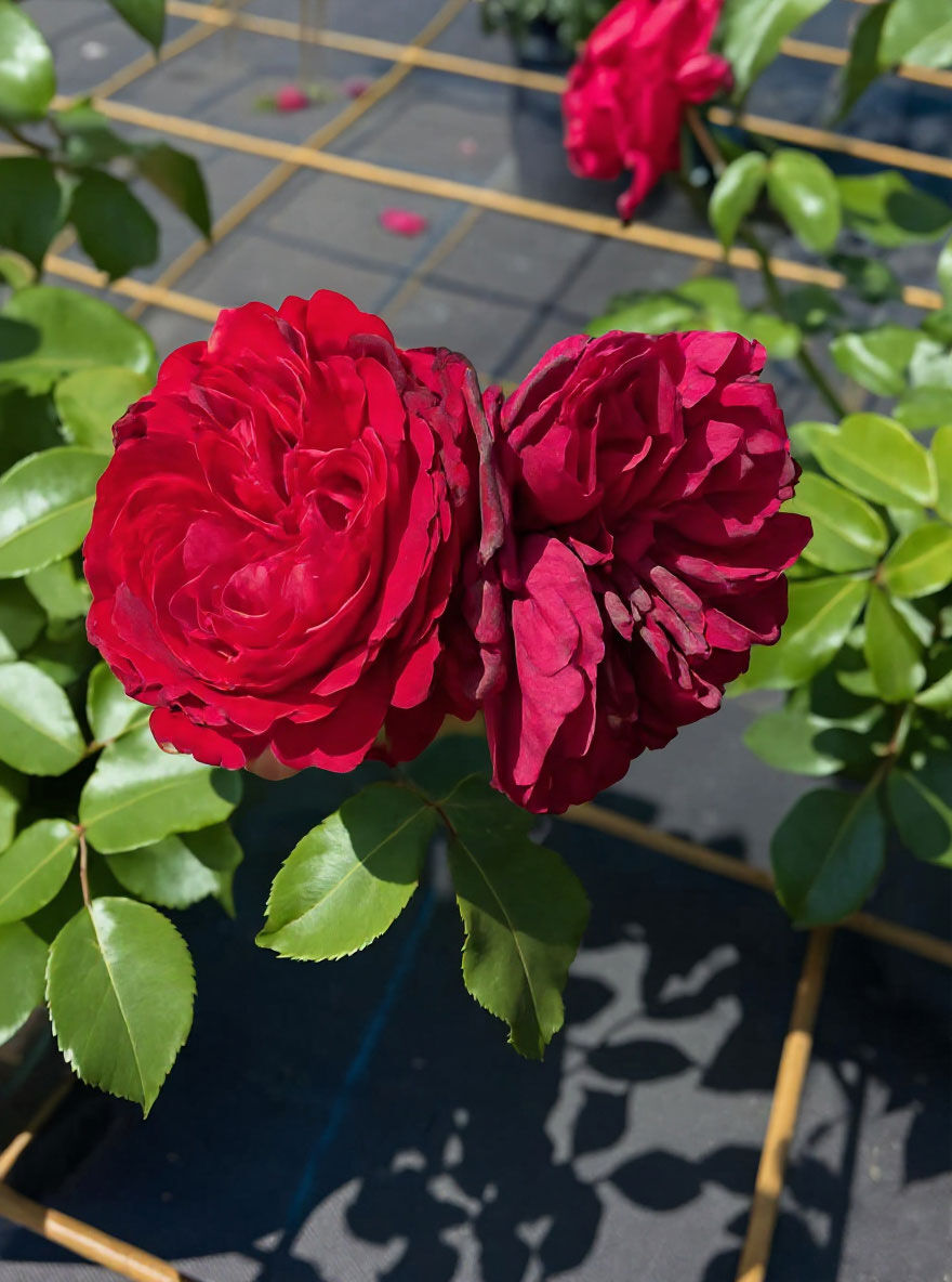 | Blüte: | Leuchtend bordeauxrot, gefüllt, kugelförmig, öfter blühend. |