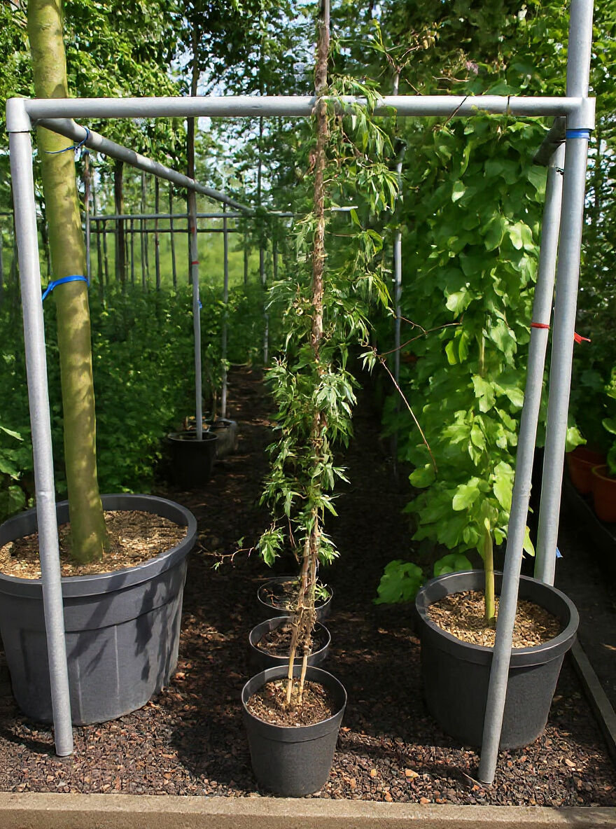 Passiflora caerulea / Blaue Passionsblume, Kletterpflanze im Topf am Stab, mit grünem Laub und langen Trieben.