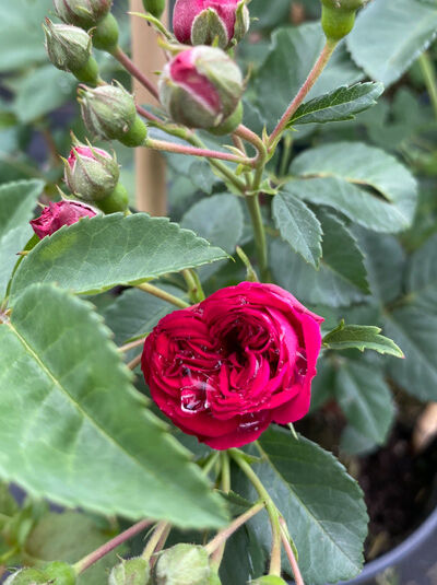 | Blüte: | Karminrot bis himbeerrot, klein, dicht gefüllt, fest, zart duftend |