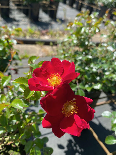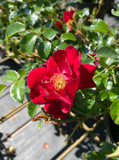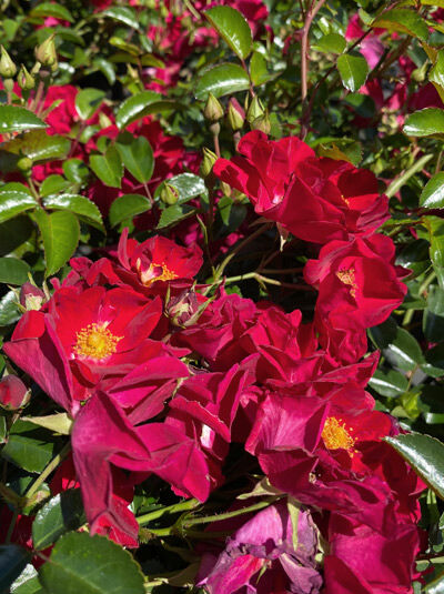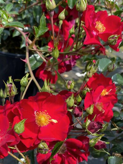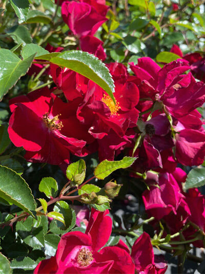 Die Bodendecker-Rose 'Alcantara'® beeindruckt mit leuchtend dunkelroten, ungefüllten Blüten und gelben Staubgefäßen, ein Magnet für Bienen und Nützlinge. Von Mai bis Oktober blüht sie in...