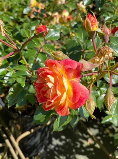 | Blüte: | Orange-rosa, locker gefüllt, öfter blühend, in Büscheln, zweifarbig |