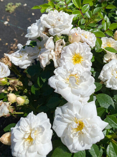 Die Bienenweide® Weiß ist eine kompakte, robuste Zwergrose mit 40–60 cm Wuchshöhe – ideal für Kübel, Terrassen und Beetränder. Ihre reinweißen, halbgefüllten Blüten mit gelben...