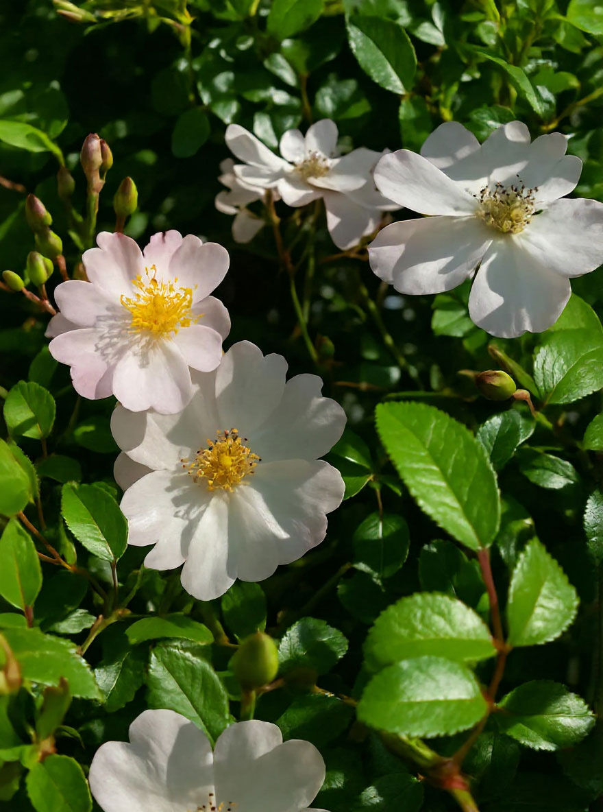 | Blüte: | Weiß-rosa, einfach, öfter blühend, klein |