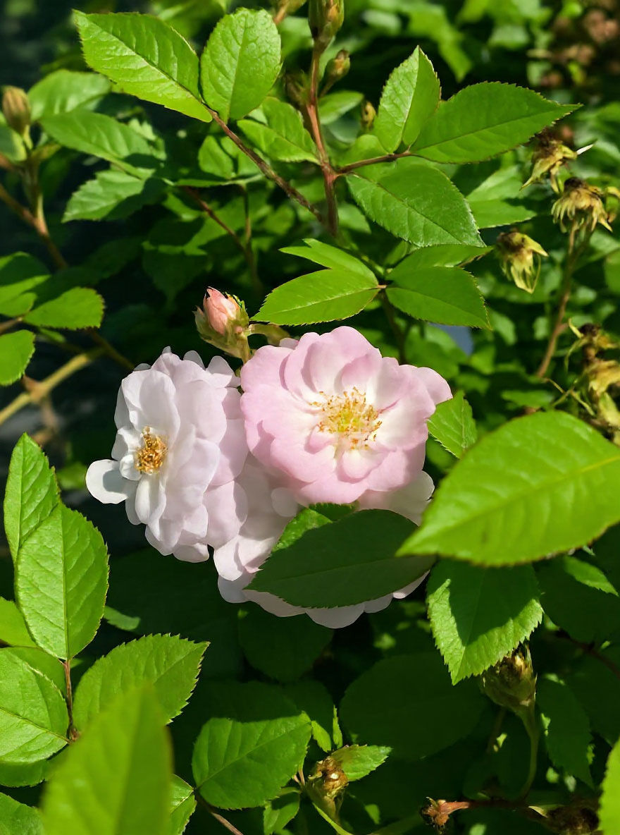 | Blüte: | Weiß mit zartrosa, gefüllt, öfter blühend, klein, leicht duftend. |