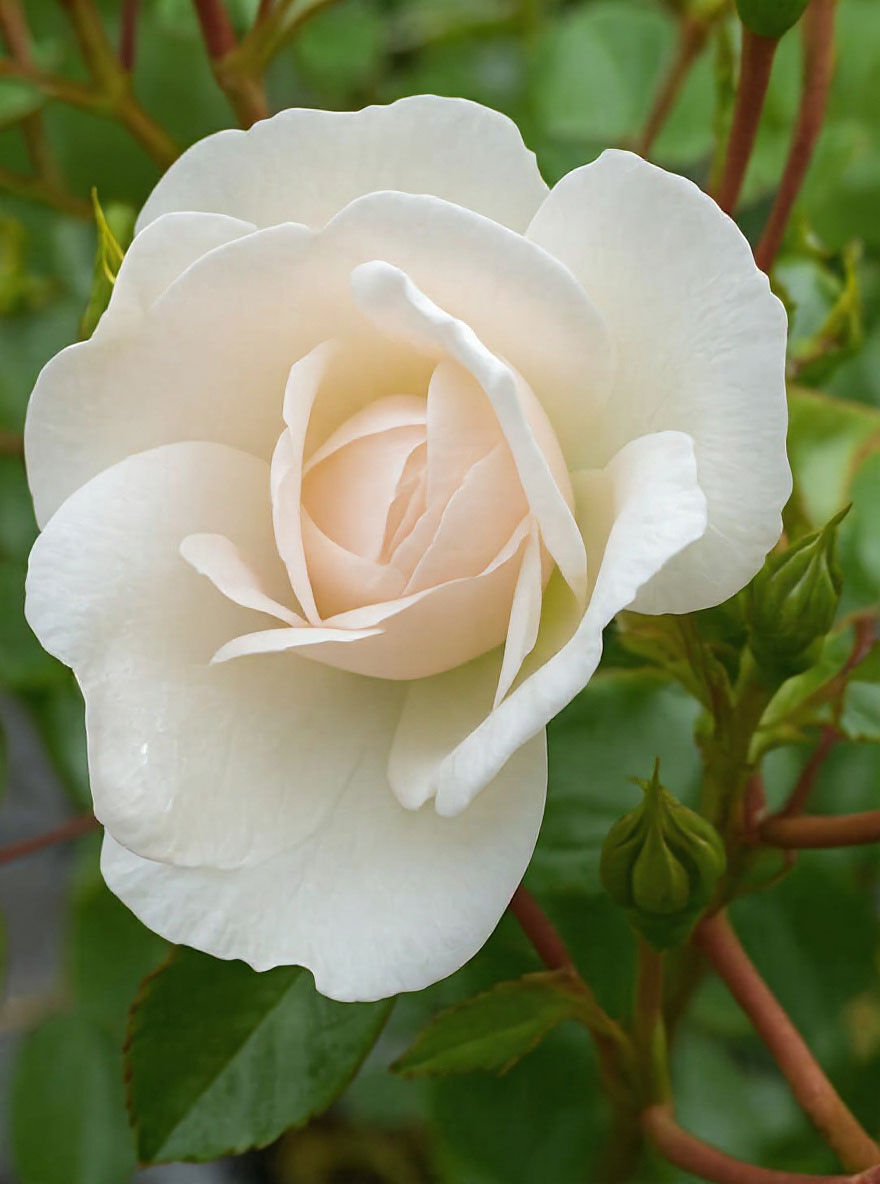 | Blüte: | Reinweiß, gefüllt, öfter blühend, schalenförmig, zart duftend. |