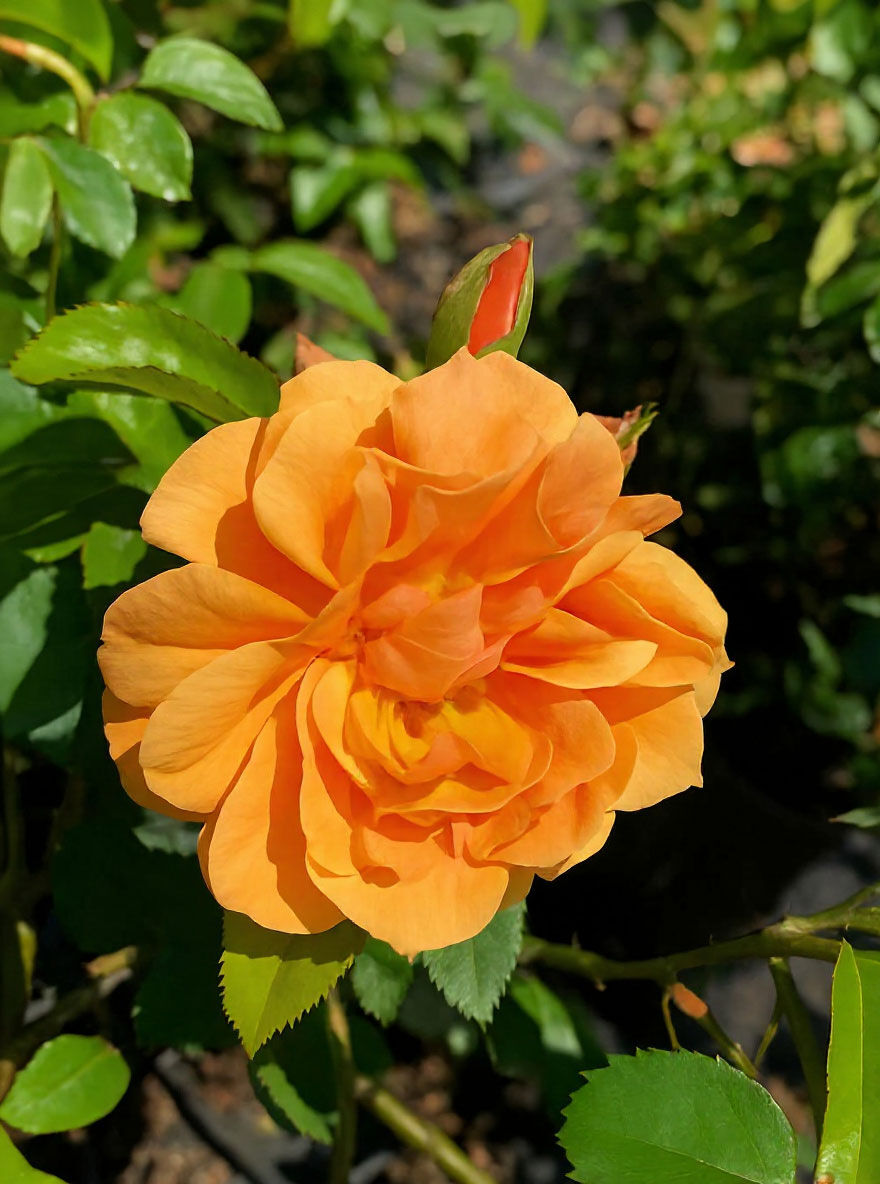 Rosa 'Skyline' / Kletterrose 'Skyline' mit gefüllter orangefarbener Blüte und Knospe am Trieb, grünes Laub sichtbar