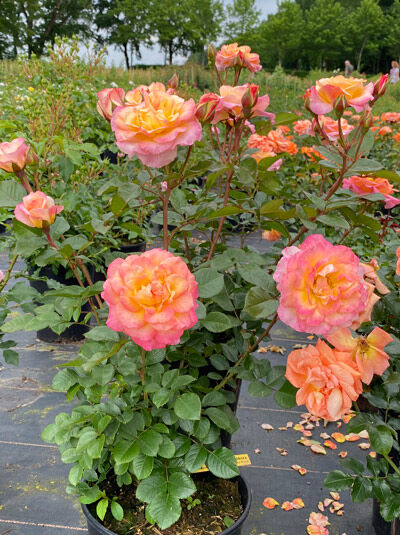 | Blüte: | Gelb-apricot-rosa-orange, schalenförmig, gefüllt, öfter blühend |