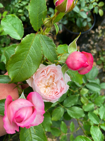 | Blüte: | Gelb mit rosaroten Rand, kugelförmig, gefüllt, duftend, öfter blühend |