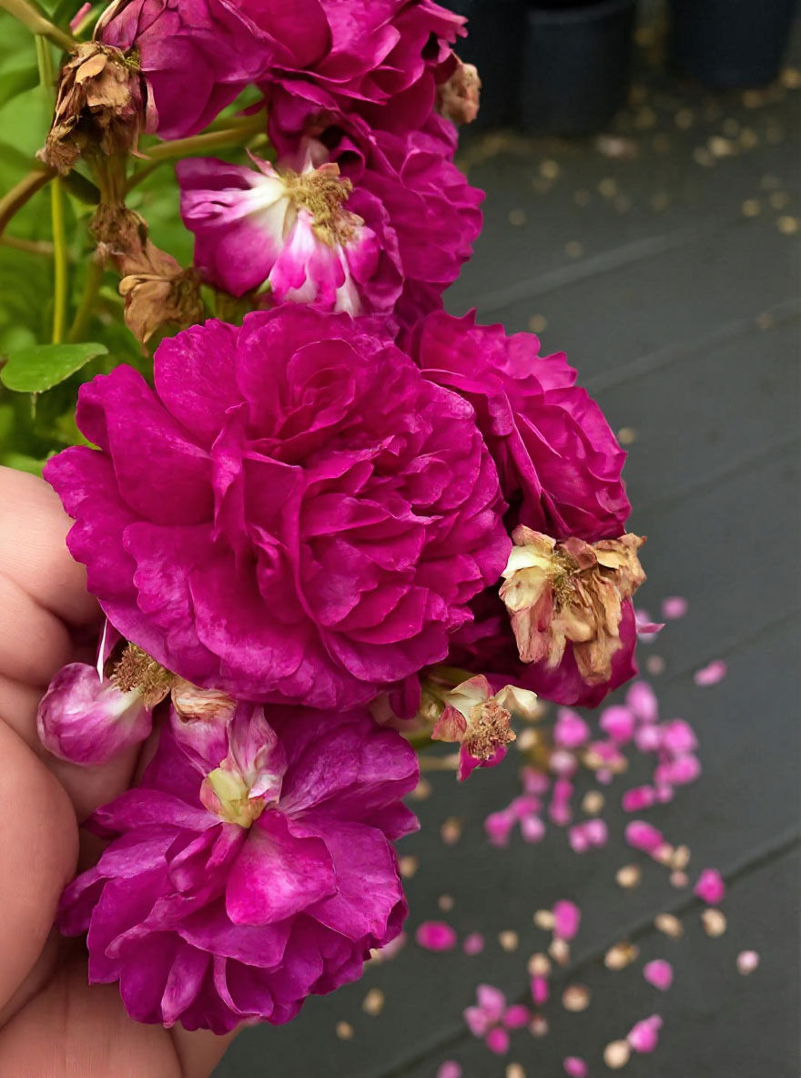 | Blüte: | Purpurviolett, halbgefüllt, öfter blühend, intensiv duftend, insektenfreundlich. |