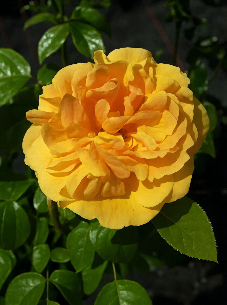 | Blüte: | Gelborange bis bernsteingelb, stark gefüllt, rosettenförmig, intensiv duftend, öfter blühend, bis zu 10 cm groß. |
