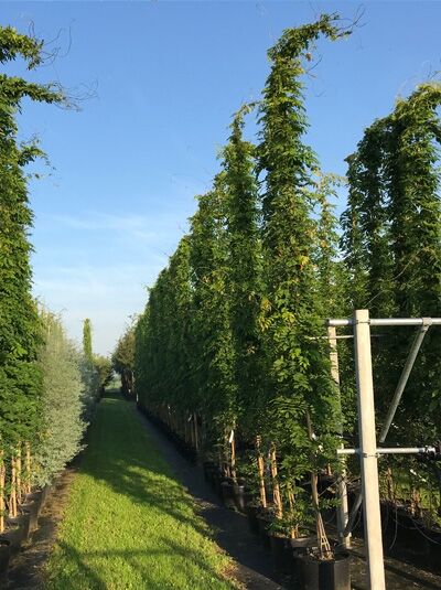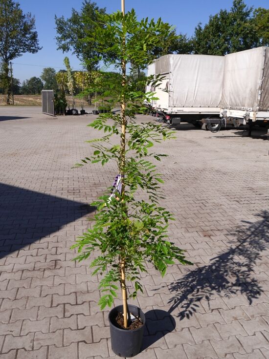 | Detaillierte Beschreibung: | Herkunft und Besonderheiten des Edelblauregens / Wisteria floribunda ’Macrobotrys‘Der sogenannte Große Edelblauregen ist eine Züchtung der Wisteria floribunda, die den meisten Hobbygärtnern unter dem deutschen Synonym Japanischer Blauregen bekannt ist. Dieser ist in den Gärten Europas eines der sehenswertesten Ziergehölze und dementsprechend stark verbreitet. Rarität, die mit einer sensationellen großen Blüte begeistertDie Selektion ’Macrobotrys‘ ist eine Rarität unter den Blauregen und ist bisher noch recht unbekannt. Sie überzeugt jeden Blauregenliebhaber mit ihrem grandiosen Anblick und verschafft sich damit zunehmend Popularität. Die eindrucksvolle und auffallend große Blüte des sogenannten Edelblauregens ist kaum zu übertreffen und sorgt in jedem Garten mit ihrer blauvioletten Erscheinung für ein romantisches Bild. Die malerische Ausstrahlung dieses Blauregens erfüllt die Umgebung und zaubert wunderschöne Naturmomente. Japanischer Blauregen ist weltweit beliebtWisteria floribunda stammt ursprünglich aus dem japanischen Inselreich und wächst dort auf sonnigen Standorten in Waldrandnähe oder auf Lichtungen. Sie gehört zur großen Familie der Fabaceae und ist eine von sieben Arten der Gattung Blauregen. Bekannt ist der Japanische Blauregen weit über seine Heimat hinaus, er ist die wohl schönste und dekorativsten Kletterpflanze in unseren Gärten und erfreut mit einem unvergleichlichen Charme jedes Gärtnerherz. Große Auswahl an Selektionen ermöglicht jedem Gärtner die VerwendungVon Japan aus wurde Wisteria floribunda im Jahre 1860 durch den Botaniker George Rogers Hall in die USA gebracht. Seitdem legte der Japanische Blauregen eine steile Karriere hin und ist mittlerweile nicht mehr aus unseren Gärten wegzudenken. Um jedes individuelle Gärtnerbedürfnis zu stillen, gibt es im Fachhandel eine große Auswahl an Selektionen, die es ermöglichen in den Genuss des malerischen Gehölzes zu kommen. Die Züchtung ’Macrobotrys‘ gilt als die am wenigsten bekannte und wird an jedem Standort zu einem sehenswerten Gartenstar. Großer Blauregen / Edelblauregen wächst bis zu 2m pro Jahr‘Macrobotrys‘ wächst rasant und mit einem jährlichen Zuwachs zwischen 50 cm 2 Metern. Sie erfreut damit den Gärtner und eignet sich bestens zur Begrünung karger Standorte oder zum Bewuchs von malerischen Lauben und Pergolen. Nach einigen Jahren zeigt sie sich mit einer Endhöhe von bis zu 8 Metern und einer Breite von bis zu 6 Metern. Die malerische Kletterpflanze rankt verzweigt und bildet eine breite Trauerform, die gerade durch die großen, hängenden Blüten besonders verstärkt wird. Der Edelblauregen schafft damit malerische Gartenträume und wertet seine Umgebung mit einem einzigartigen romantischen Charme auf. Harmonisches Gesamtbild durch den dezenten Stamm und frisches BlattDer Stamm des Blauregens.... |