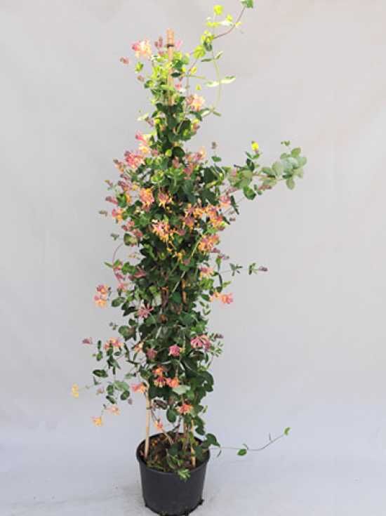 Lonicera periclymenum / Wald-Geißblatt 175-200 cm C10, Kletterpflanze im Topf mit grünen Blättern und rosa-gelben Blüten