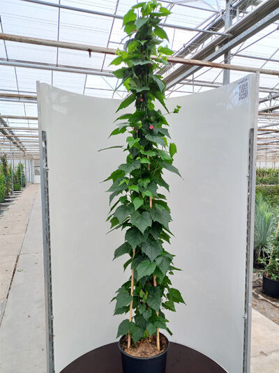 | Wuchs: | Mittelgroßer Strauch, aufrecht, halb kletternd, halb strauchartig, verzweigt, buschig, 2 m m hoch und ebenso breit, als Hochstamm einstämmig. |
