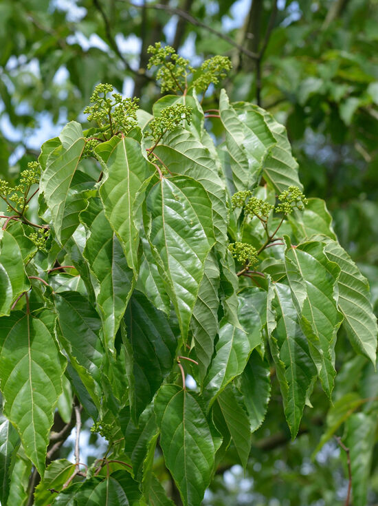 | Eigenschaften: | Hovenia dulcis (Rosinenbaum) ist ein robuster Zierstrauch, der mit einer extravaganten Frucht und einem ledrig grünen Blattwerk verwöhnt. Die asiatische Pflanze verleiht dem deutschen Garten fernöstliches Flair und gilt als echte Rarität, denn sie schmückt nur wenige deutschen Heimgärten. Der kleinen Baum wächst malerisch und sollte in Einzelstellung an einem sonnigen Standort gepflanzt werden. Hier schenkt er exotische Naturmomente. Die anschwellenden Fruchtstiel sind essbar und erinnern an den Geschmack und die Optik von Rosinen. |