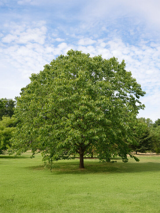 | Blatt: | Sommergrün, eiförmig, groß, zugespitzt, leicht gesägter Blattrand, dunkelgrün, Unterseite fein behaart. |