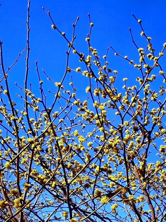 | Blüte: | Blütendolden, 3 bis 5 Einzelblüten, tief gelb, vor dem Blattaustrieb, unscheinbar. |