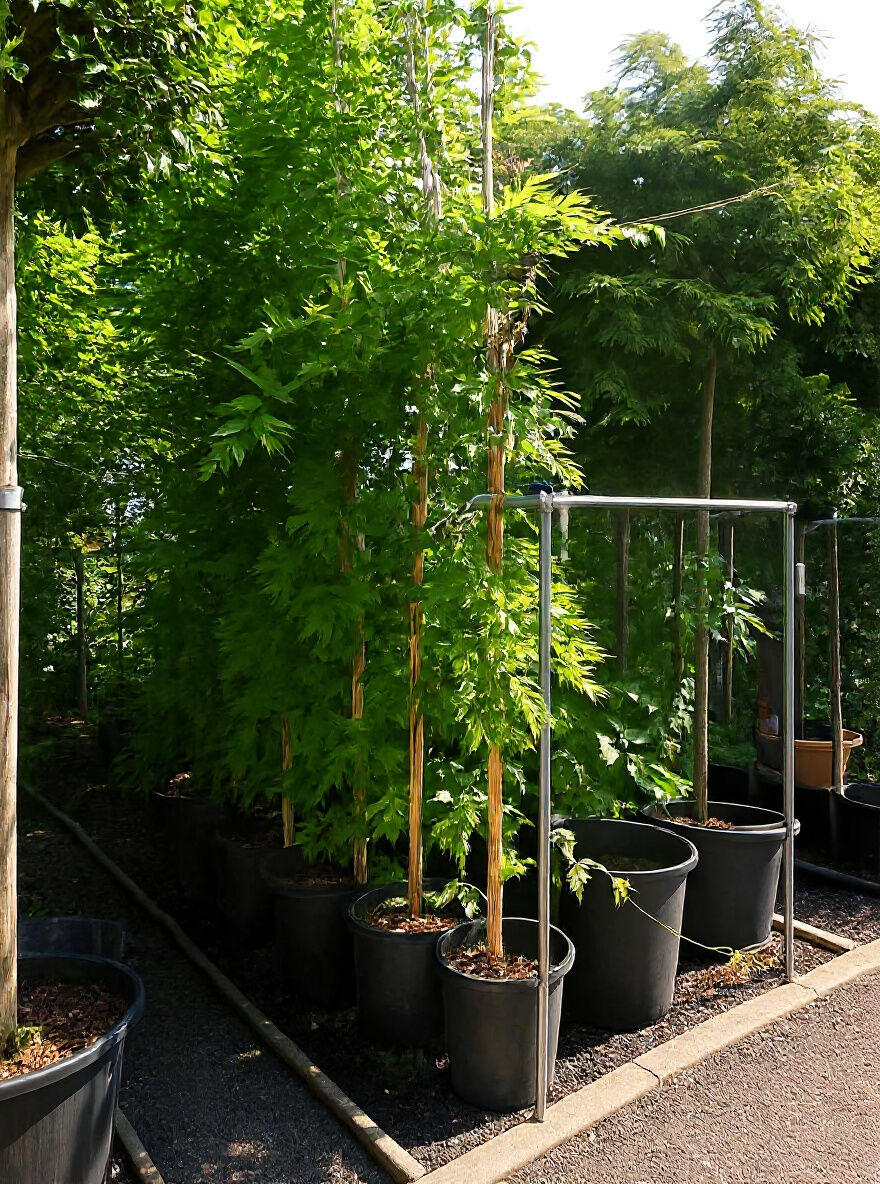 Wisteria floribunda 'Domino' / Wisteria formosa 'Issai' – Blauregen 'Issai' im Topf, aufgebundene Kletterpflanzen an Stäben im Bestand