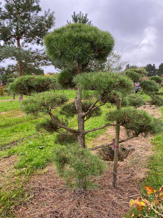Waldkiefer (Pinus sylvestris) Garten-Bonsai, 160 cm breit x 210 cm hoch, mit mehrstämmigem Wuchs und geschnittenen Kronenpolstern.