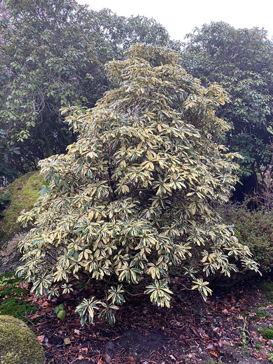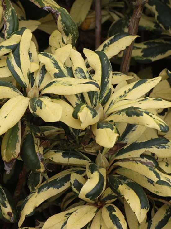 Rhododendron Hybride 'Carolina Spring' / Rhododendron 'Carolina Spring', panaschierte gelb-grüne Blätter am Strauch