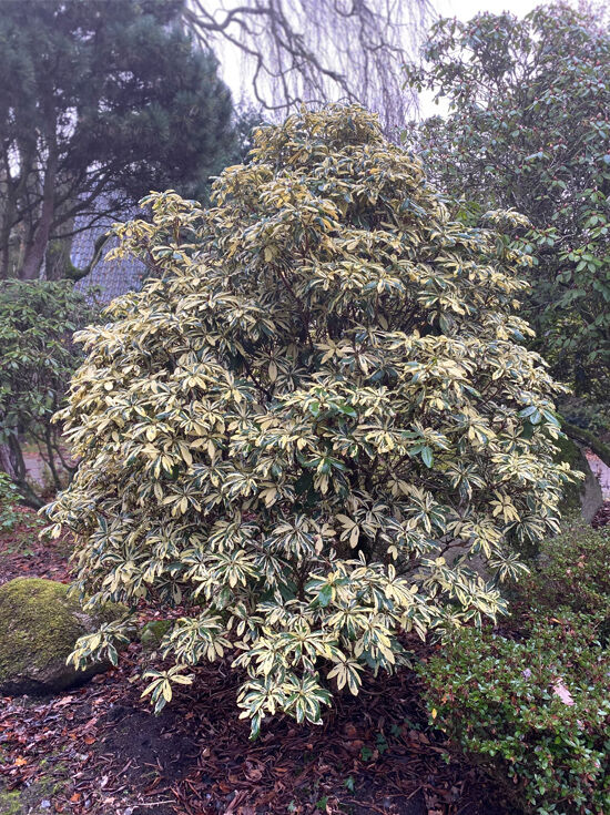 Rhododendron Hybride 'Carolina Spring' / Rhododendron 'Carolina Spring' Solitärstrauch mit panaschiertem Laub, 250–275 cm hoch, 200 cm breit