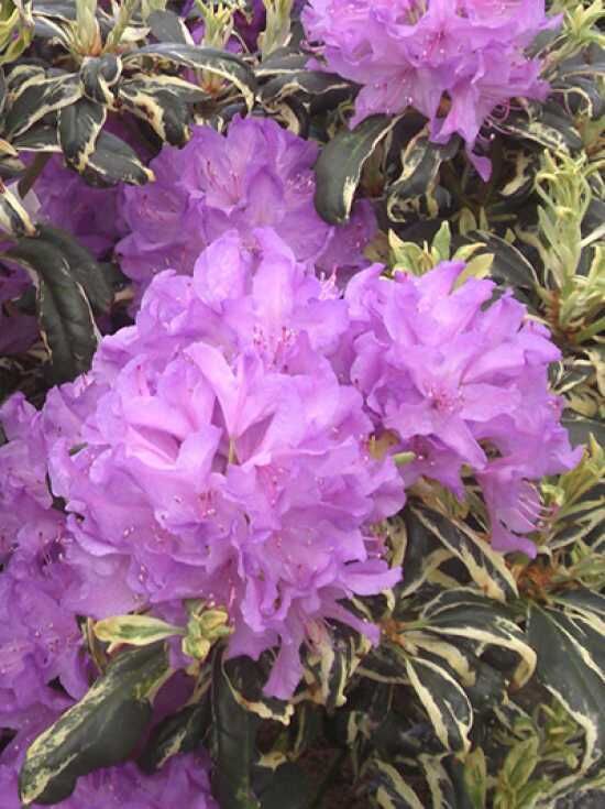 Rhododendron Hybride 'Carolina Spring' (Rhododendron 'Carolina Spring') mit lila Blüten und panaschierten Blättern