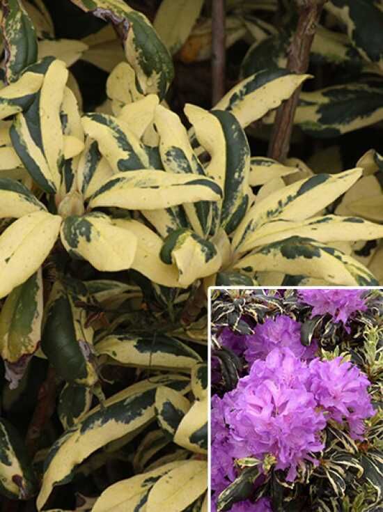 Rhododendron Hybride 'Carolina Spring' / Rhododendron 'Carolina Spring' mit gelb-grün panaschierten Blättern und violetten Blütenrispen