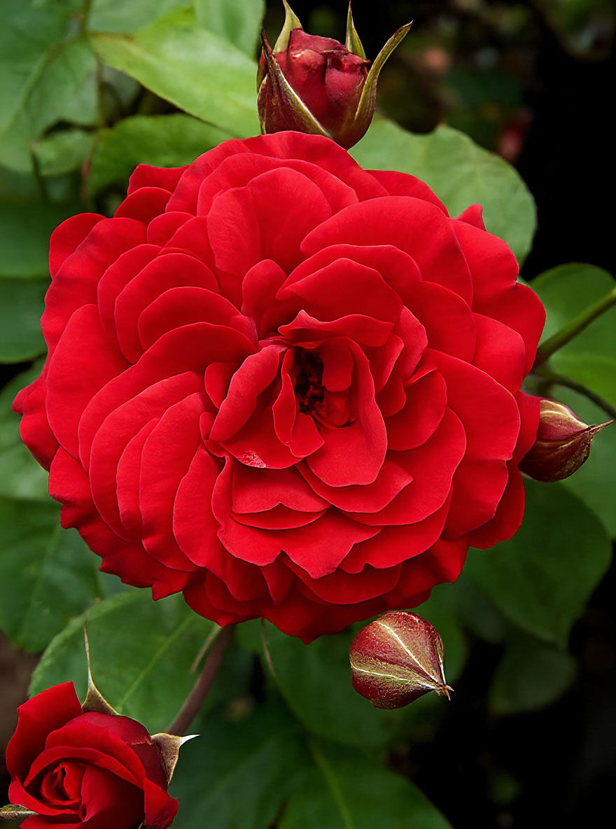 Beetrose Rosa 'Nina Weibull ®' mit gefüllter roter Blüte und mehreren Knospen am Trieb, umgeben von grünem Laub.