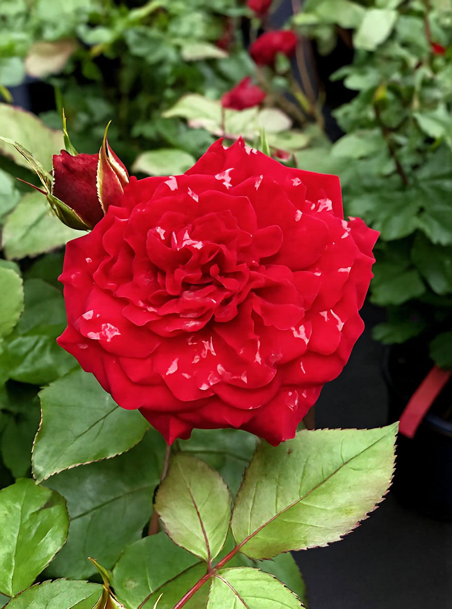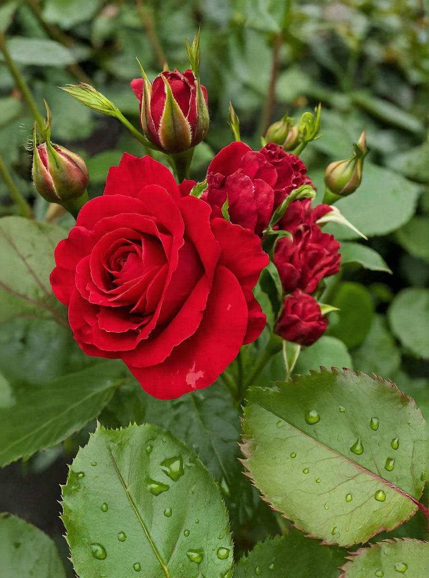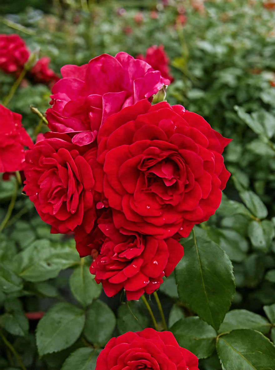 Rosa 'Nina Weibull ®' / Beetrose 'Nina Weibull' mit roten Blüten und Knospen am Trieb, grünes Laub mit Tropfen