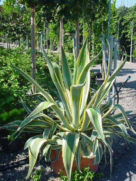 Eigenschaften: Die Agave americana 'Variegata' (Amerikanische Agave 'Variegata') erweist sich als sehr pflegeleicht und kommt auch gut mit Trockenheit zurecht, da sie Wasser und Nährstoffe in ihren Blättern speichern kann. Oft wird diese Sorte als Kübelpflanze gesetzt.