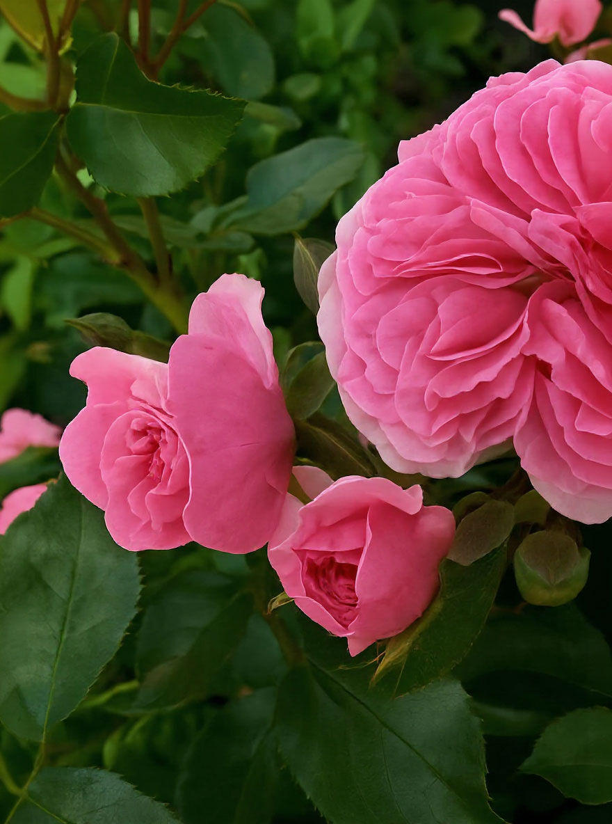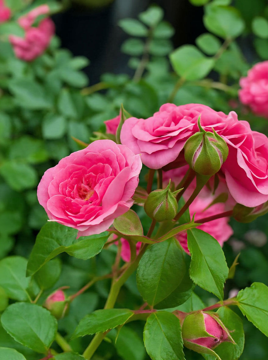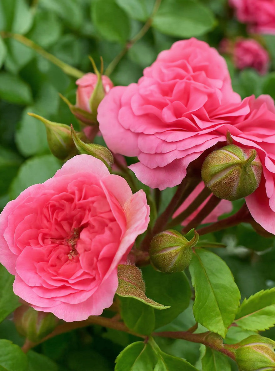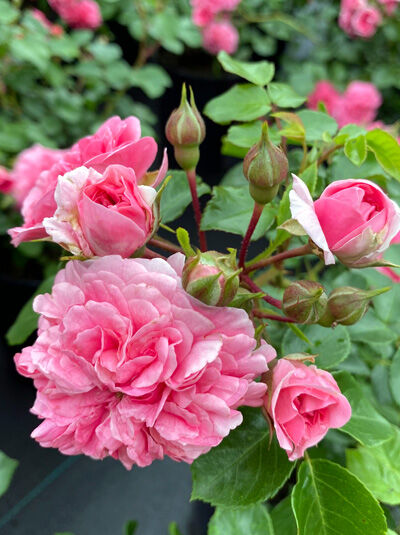 | Blüte: | Rosa bis Pink, stark gefüllt, in Dolden, geringer Duf, mittelgroß, 5 bis 10 cm breit. |