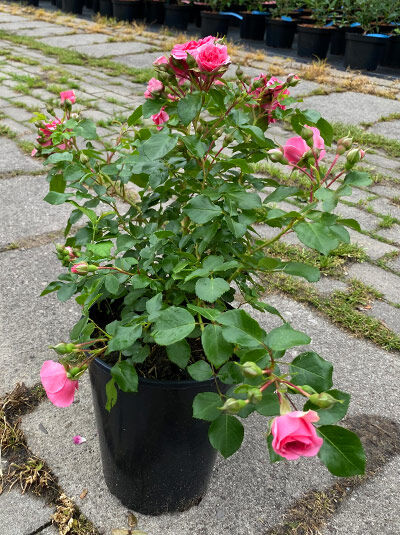 Rosa 'Pink Swany' (Beetrose 'Pink Swany') im Topf, grüne Blätter und mehrere pinke Blütenknospen und Blüten, A-Qualität C 4