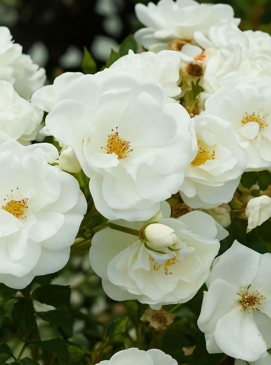 | Blüte: | Reinweiß, halbgefüllt, leicht duftend, reichblühend, mittelgroß, bis zu 10 cm breit |